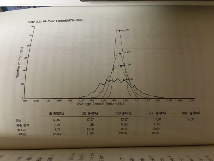 아래의 그림은 '워렌버핏 집중투자' 15종목, 50종목, 100종목, 250종목을 랜덤으로 추출한 포트폴리오를 18년동안 백테스팅으로 테스트했을때의 그림입니다.
