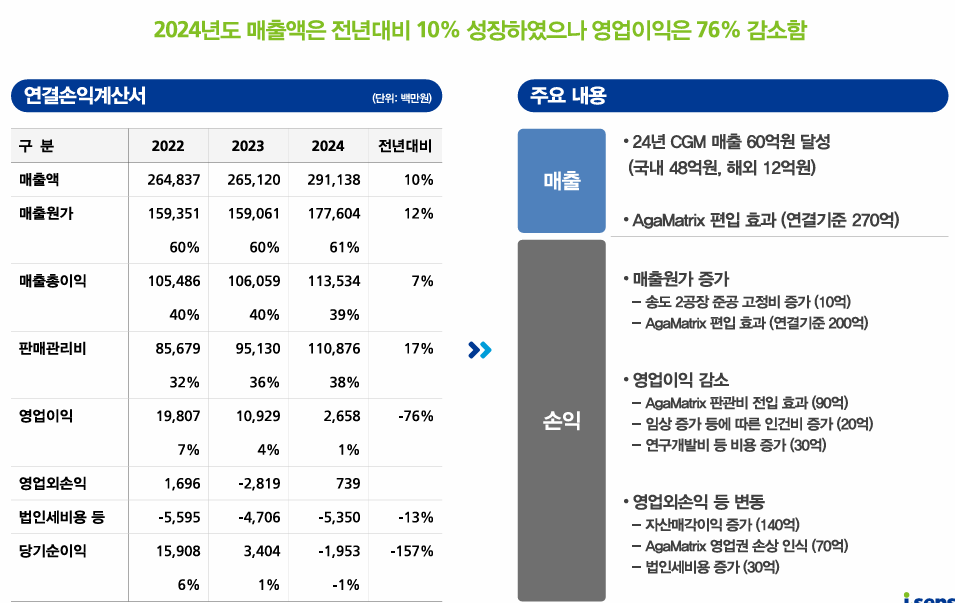 2024년 실적은 2911억으로 매출 총이익은 40%대를 계속 유지중으로 아이센스는 기존에 BGM의 안정적인 매출성장을 하고 CGM의 성장동력을 보유한 회사에서 CGM의 매출로 회사를 퀀텀점프 시키기위해 금전적 시간투자를 대량으로 해야하는 청소년기의 회사로 돌아간 상태이다. 다시 벤처가 되었다고 생각하면 될 것 같다.