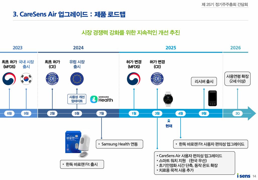차세대 CGM (케어센스 에어 2): 특징: 크기/무게 70% 감소, 사용 기간 15일 → 18일, 안정화 시간 10분, 데이터 수집 주기 5분 → 1분. 일정: 2026년 국내 허가, 2027년 유럽 허가, FDA 승인 후 미국 시장 진출.